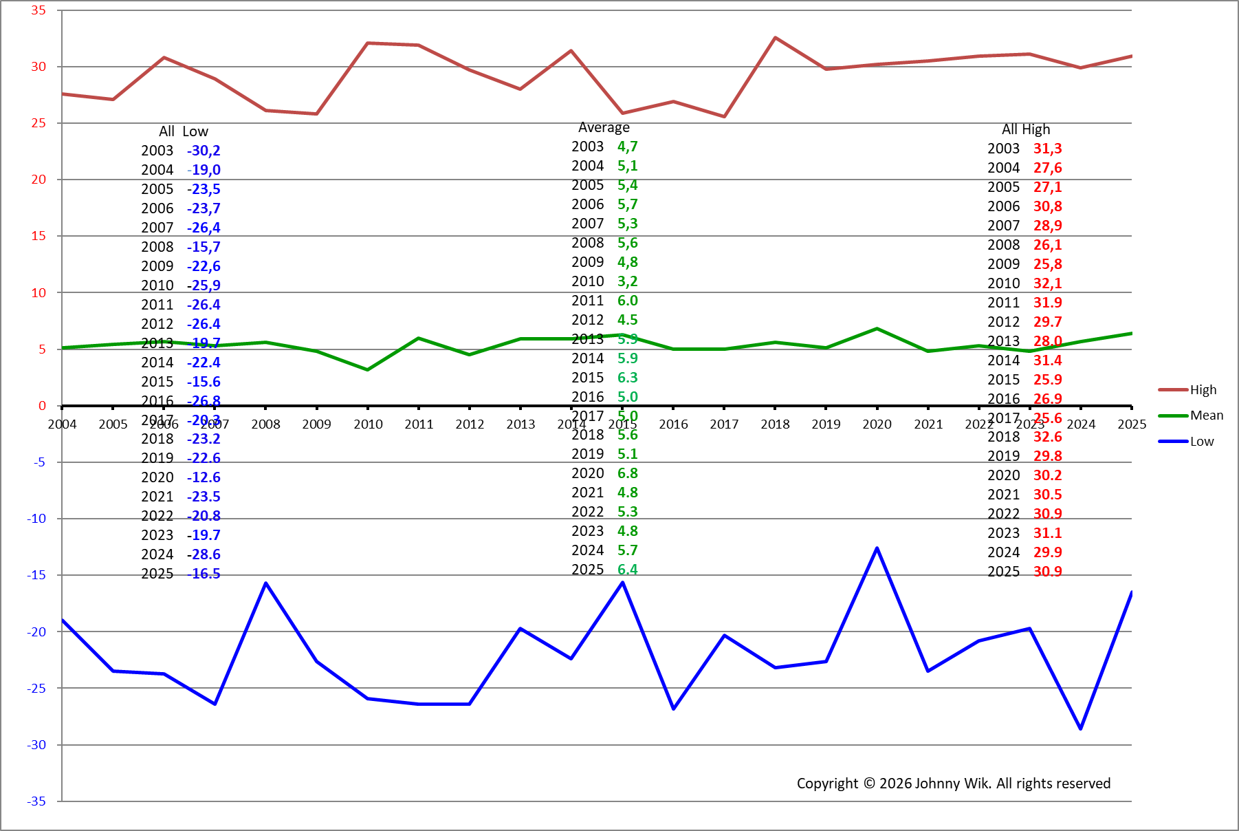 | Chill | Low Today -6.7°C at 5:11 | Month Low -6.7°C | Year Low -24.4°C |